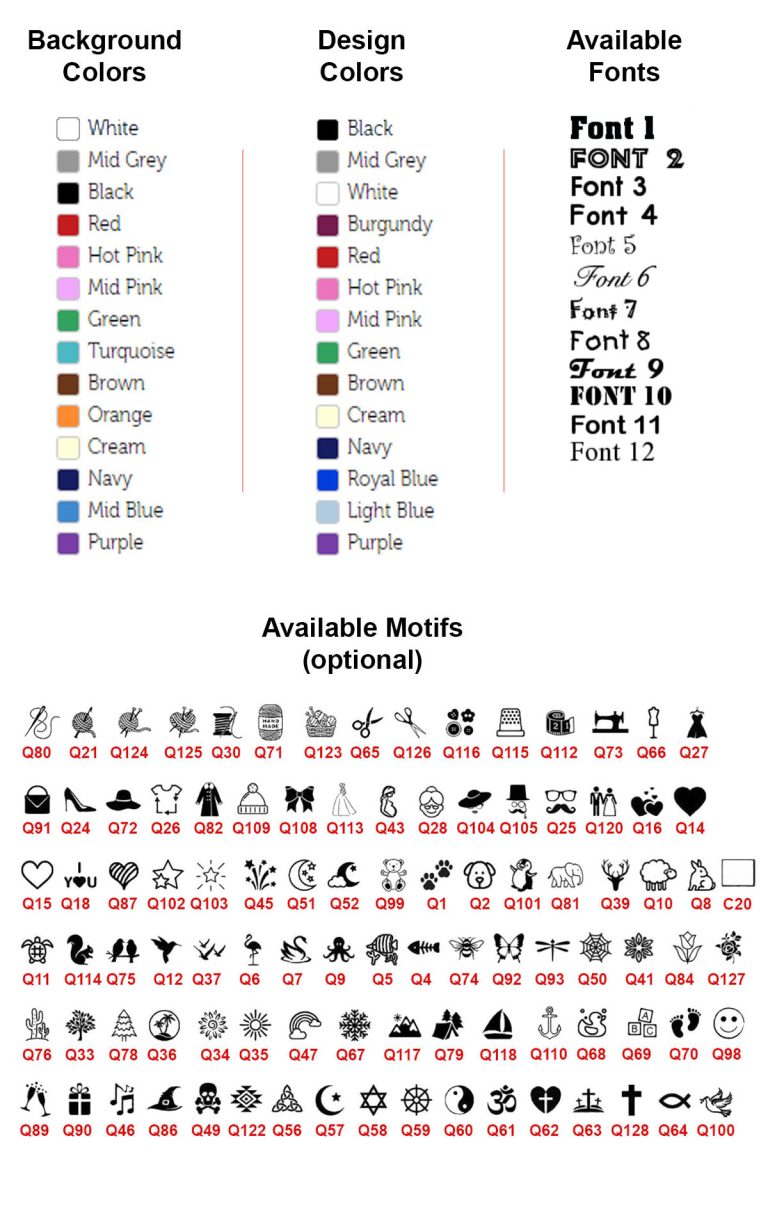 A wide range of background and lettering colours as well as lettering styles are available to suit your requirements. A selection of motifs that fit beside the text are also available.