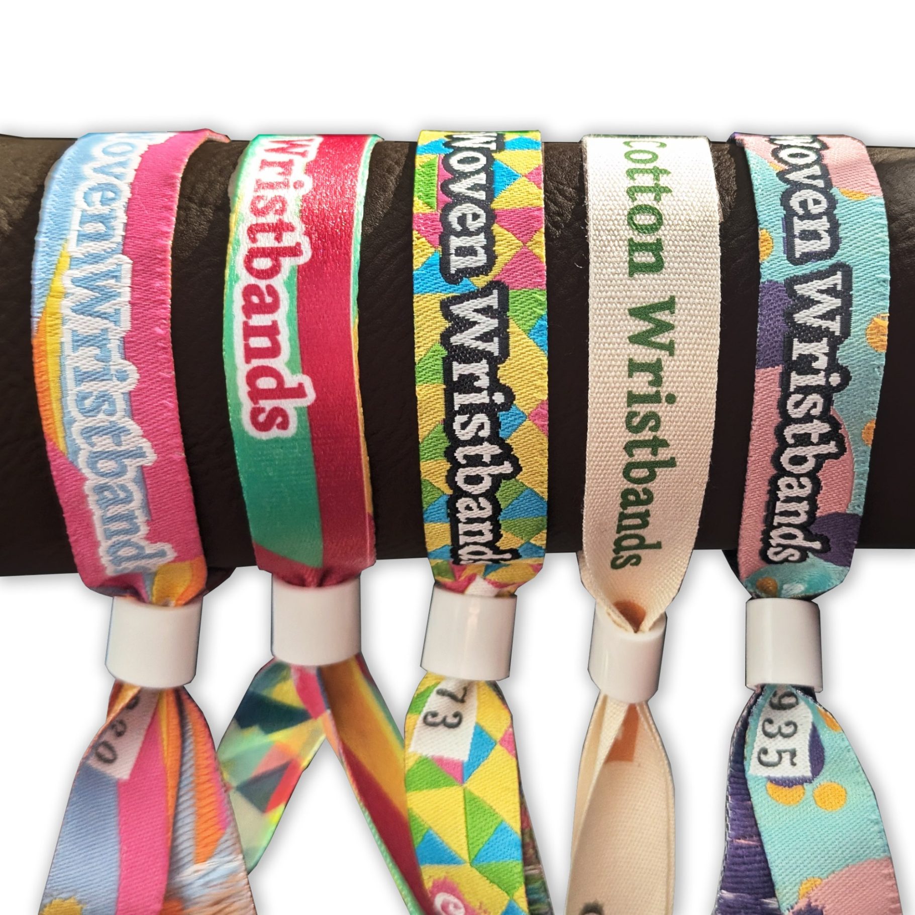 Custom woven festival wristbands made with recycled polyester yarn in vibrant colours. Supplied with barrel lock as standard, ready to thread onto wrists and lock into place.